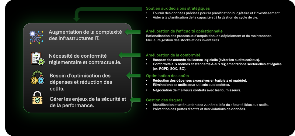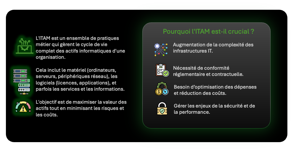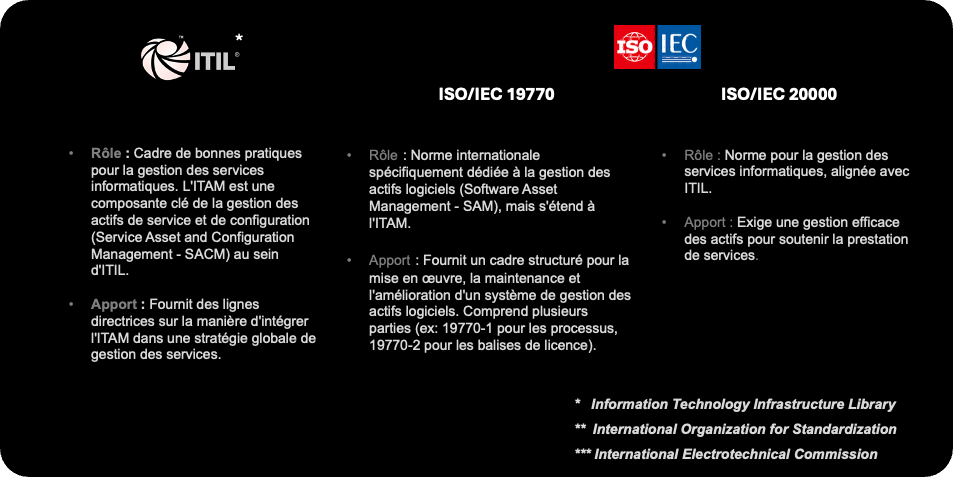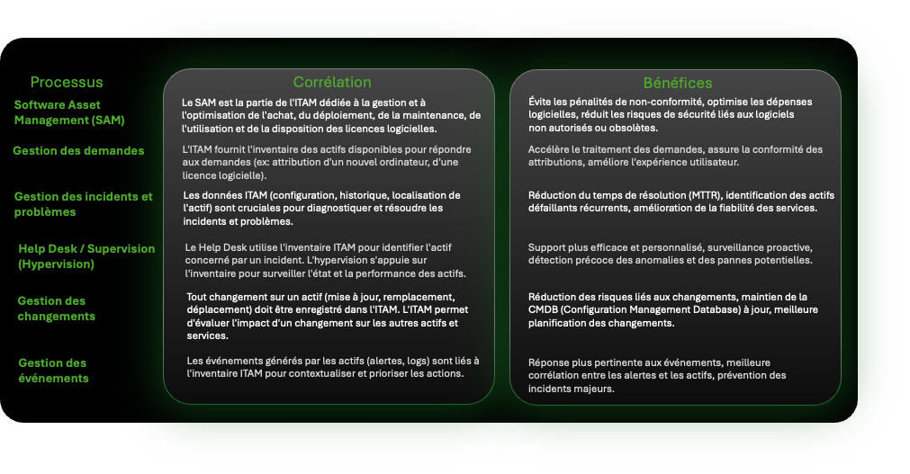 L'ITAM est un pilier fondamental de l'ITSM (Information Technology Service Management). Une intégration étroite assure une gestion cohérente et efficace des services. Le Software Asset Management (SAM) est une composante essentielle de l'ITAM.