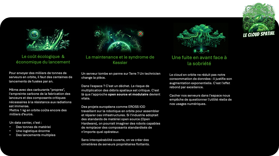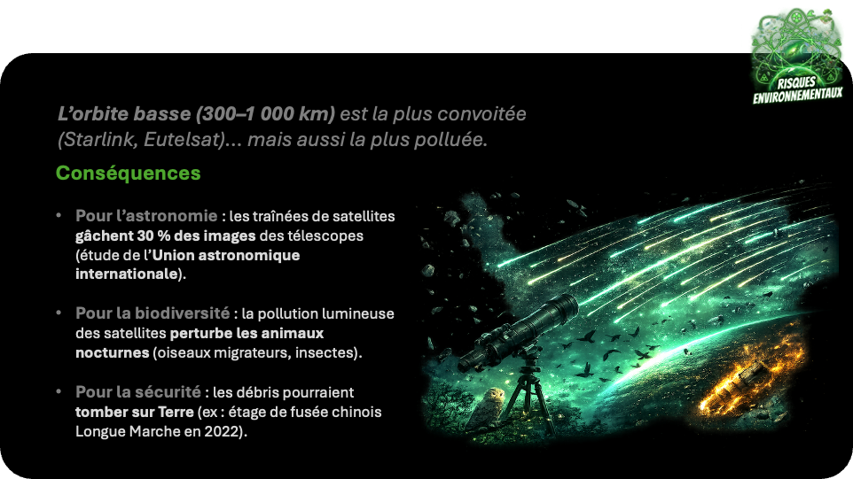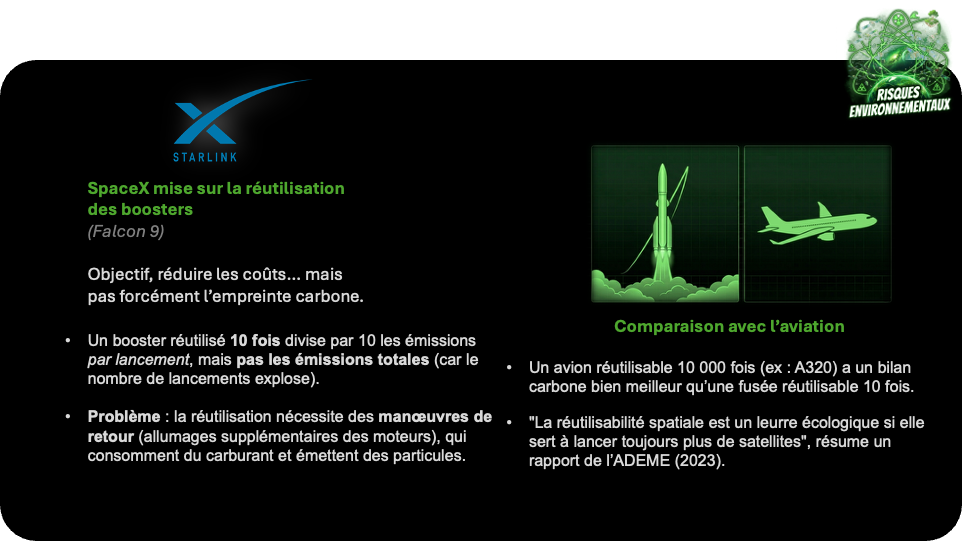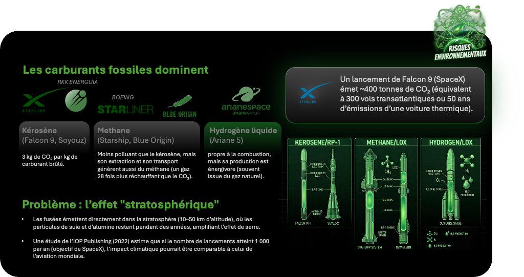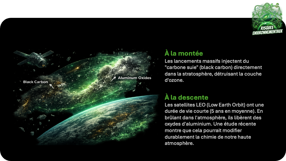 pollution atmosphérique, déchets orbitaux, empreinte carbone
